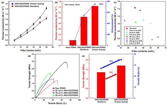 The thermal conductivity of the composite and matrix are expressed as Kf and Km, respectively. The composite prepared with freeze drying method depicts improved thermal conductivity by 137% compared to the randomly dispersed composite due to the continuous 3D heat pathway. Therefore, the heat dissipation along the oriented thermal pathway of the resulting AlN/rGO/PDMS composite after forming the 3D network foam using the freeze-drying and annealing processes are superior to other methods. To verify the superior thermal properties of AlN/rGO/PDMS, we compare to other previous studies using various fabrication methods, as shown in Figure 6c [40,41,42,43,44,45,46]. The mechanical properties of the composite are analyzed using UTM. The compatibility of the matrix and the filler and the aggregation of the hybrid filler affect the mechanical properties of the composites critically. The tensile strength and tensile strain of the AlN/rGO/PDMS composite filler according to the filler content differ according to the difference in interfacial compatibility and dispersibility, and the comparison values are shown in Figure 6d. As the filler content increases, it forms a 3D network, connecting in a through-plane direction rather than an in-plane direction. Therefore, a higher filler content increases tensile strength but decreases tensile strain. Figure 6e is the tensile strength–strain graph according to the manufacturing process of the AlN/rGO/PDMS composite material. The freeze-dried AlN/rGO/PDMS composite (1.7 MPa) shows higher mechanical properties including tensile strength and tensile strain than randomly dispersed composites (1.35 MPa) due to their network structure. Therefore, there is considerable potential for the TIM development approach.