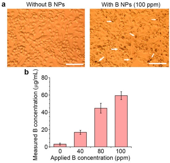 (a) Micrographs of MNNG/Hos osteosarcoma cells without nanoparticles and after 24 h of incubation with the B NPs at a 100 ppm concentration. Arrows indicate aggregates of B NPs on the cell surface. Scale bar—100 µm. (b) Quantitative analysis of boron concentration in cells by ICP-MS.