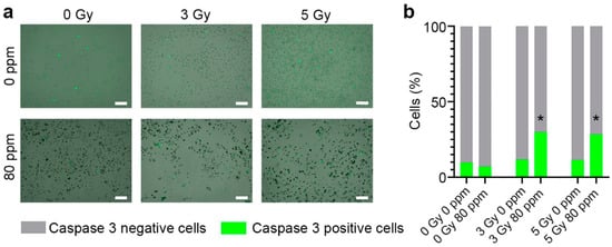 Representative images (a) and quantification (b) of MNNG/Hos cells incubated with different concentrations of B NPs and stained with NucView caspase-3 dye. Green fluorescence shows apoptotic cells. Cells were irradiated with protons at the Bragg peak at 3 and 5 Gy doses in the absence or presence of boron nanoparticles (80 ppm). Scale bar—100 µm. * p < 0.05 via the Mann–Whitney U test.