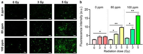 We found that proton irradiation indeed led to a slight but significant increase in the level of intracellular ROS, which was confirmed by brighter-colored zones in the microphotographs (Figure 5a). At the same time, the pretreatment of the cells with B NPs at a 80 ppm concentration led to a sharp increase in the level of ROS at both 3 and 5 Gy. The increase in the B NP concentration up to 100 ppm resulted in a further increase in the ROS level. It is worth noting that the proton irradiation of cells with the 5 Gy dose in the presence of the B NPs in 100 ppm concentration led to a six-fold increase in the level of ROS compared to the non-irradiated control, which confirmed the high activity of ROS generation by the B NPs under proton irradiation (Figure 5b).