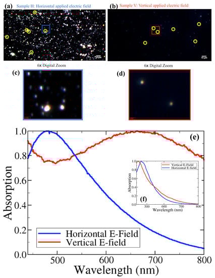 Based on the measured absorption spectra shown in Figure 2, we can readily understand the colors observed in Figure 1. For the horizontal polarization, the absorption peak appears around 480 nm, which leads to a complementary orange/red color for the reflected light. For the vertical polarization, however, the main absorption peak is located around 700 nm, which leads to a reflection in the green [].