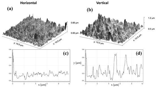 Top panels (a,b): three-dimensional representation of two AFM scans of two typical samples deposited with two orthogonal polarizations of the DC bias during deposition with otherwise identical plasma conditions. Lower panels (c,d): profile scans of above samples in two randomly chosen directions. Note that the overall roughness is about six times higher for the vertically than for the horizontally applied electric field deposition.