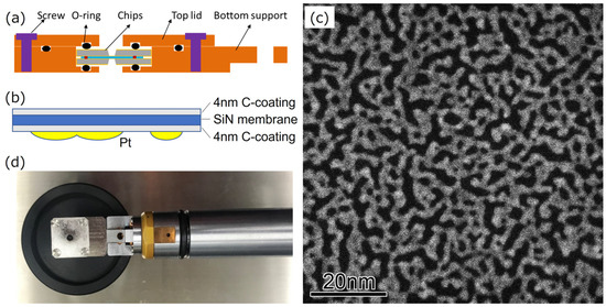 - Li, X.; Mitsuishi, K.; Takeguchi, M. Effect of amorphous carbon coating on the performance of liquid phase transmission electron microscopy (LP-TEM) and the dynamics of enclosed Pt nano-colloids. Microscopy 2022, 71, 181–186. [Google Scholar] [CrossRef]