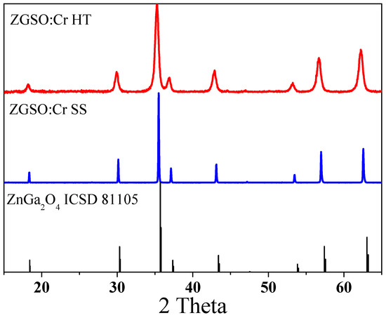 ZGSO:0.5%Cr3+ possesses a normal spinel structure belonging to the cubic lattice system with two tetrahedral and four octahedral sites per formula unit, as shown in Figure S2 in the Supplementary Materials. The ZGSO matrix is comprised of cubic, close-packed oxides with space group Fd-3m [37]. Ga3+ cation size (0.76 Å, CN = VI) is smaller than the Zn2+ (0.88 Å, CN = VI) and Sn4+ (0.83 Å, CN = VI) cations, respectively. The radius of trivalent cations in octahedral site Cr3+ (0.755 Å) is close to that of Ga3+, and therefore Cr3+ is inclined to occupy the octahedral Ga3+ sites. In this structure, a part of the Zn occupies the tetrahedral sites, while the rest of the Zn2+, as well as all Ga3+, and Sn4+ are expected to occupy the octahedral sites [41]. To confirm the crystal structure of our materials, Powder XRD measurements were conducted and analyzed, as shown in Figure 1. The XRD results show that ZGSO:0.5%Cr3+ can be successfully prepared using both HT and SS methods. All of the recorded diffraction peaks in the XRD pattern are basically consistent with the standard ZnGa2O4 card (ICSD No. 81105) with a slight shift in the diffraction peaks due to the presence of Sn4+ inside the structure with a larger radius than Ga3+.