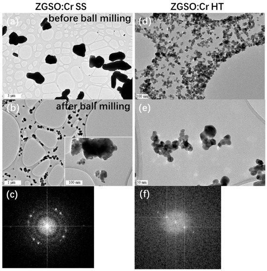 TEM images of ZGSO:0.5%Cr3+ (a) before and (b) after a BM treatment after SS method preparation, insert of (b) is part enlargement. (c) Electron diffraction (ED) of the ZGSO:0.5%Cr3+ SS. (d,e) TEM images of ZGSO:0.5%Cr3+ prepared by HT method after BM treatment. (f) Electron diffraction (ED) of the ZGSO:0.5%Cr3+ HT phosphors after BM, respectively.