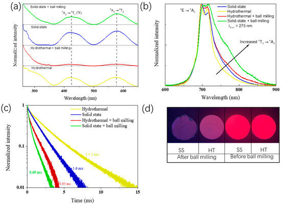 As can be seen from the emission spectra obtained under excitation at 275 nm (UV excitation) in Figure 3b, both synthesized samples before BM have a strong emission peak at ~700 nm in the deep red (or NIR-I) range. While the emission peak is mainly caused by the 2E → 4A2 transition of Cr3+, there is a small contribution from the 4T2 → 4A2 transition, as these levels are in thermal equilibrium [38]. In relation to their emission bands, there is a higher PL intensity ratio of Cr3+ 4T2 → 4A2 transition over 2E → 4A2 transition in the solid-state samples compared to the samples obtained using the HT method [54,55]. When samples were treated by BM for HT and SS, an increased contribution of the 4T2 →4A2 transition was found. The increase of 4T2 → 4A2 to 2E → 4A2 ratio after BM suggests the creation of new non-radiative energy loss paths after obtaining the nanoparticles, possibly due to the formation of surface defects, which is a side effect of the BM procedure and also explains the poor signal to noise ratio in samples after BM. In Figure 3d, the image obtained during UV excitation of the samples clearly shows that after BM there is a significant decrease in the PL intensity.