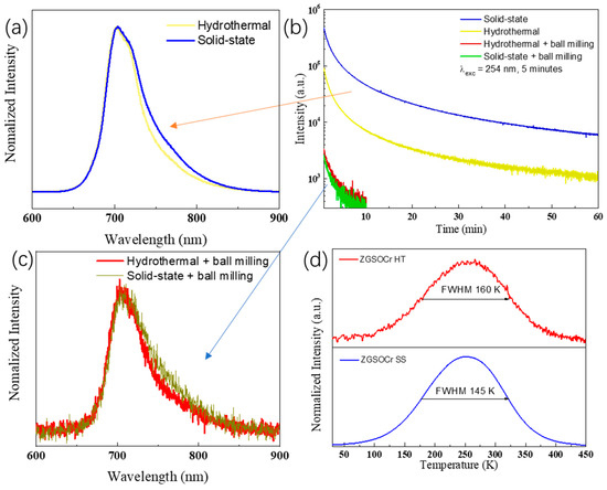 Lifetime was used for the evaluation of the optical properties of materials, with a focus on their efficiencies. For the 2E emission level of Cr3+ in ZGSO, a lifetime value of around 3 ms was found for the material prepared using the HT method, while for the material prepared using the SS method, its lifetime value is around 1.6 ms when excited at 450 nm. Even after changing the excitation wavelengths through a large excitation energy range from 254 nm to 550 nm, Cr3+ 2E manifold lifetime does not change significantly (Figure S1). It is at first quite surprising to find higher lifetime values for the material prepared using the HT method, as the calcination temperature is lower, which usually leads to lower crystallinity and the existence of additional non-radiative paths, decreasing the average lifetime. However, in PersL phosphors, as trapping is the most relevant effect, this suggests that during excitation, traps are being filled, which would reduce the lifetime of the manifold. This will be investigated in more detail in the following section (see Figure 4d) with thermoluminescence glow curves. In the case of ZGSO:0.5%Cr3+, one must also consider that in the solid-state elaboration method, there is also a higher contribution of the 4T2 → 4A2 transition, which also explains the lower lifetime value when compared to the samples prepared using the HT method. After BM, lifetime values for both preparation methods decrease. 2E manifold lifetimes decrease from 3 ms to 0.95 ms for hydrothermal method and from 1.69 ms to 0.69 ms for solid-state one, respectively, corroborating the BM effect on the PersL intensity. As for the PL intensity, lifetime measurements show that the BM creates alternative, non-radiative pathways, as the 2E manifold’s lifetime decreases drastically following the formation of nanoparticles.