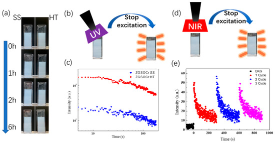 (a) Suspension stability measurement of the NPs obtained using the solid-state or hydrothermal methods, ZGSO:0.5%Cr3+ NPs dispersed in water for up to 6 h, (b) scheme of UV excitation for PersL of ZGSO:0.5%Cr3+ NPs suspension, (c) PersL decay curves of the suspension (0.2 mg/mL dispersed ZGSO:0.5%Cr3+NPs prepared using both methods). (d) scheme and (e) decay curve of NIR optical stimulated luminescence of the ZGSO:0.5%Cr3+ HT NPs with ~25 nm diameter in 0.2 mg/mL water suspension. (Excitation by 980 nm laser diode with three cycles).