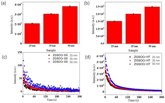To better understand the nanoparticles’ size effect on PersL properties in suspension, suspension samples of ZGSO:0.5%Cr3+ NPs (0.2 mg/mL in DI water) were prepared, for both the SS and HT methods, using NPs with average sizes of 25, 35 and 50 nm (with <10% size errors, when determining average particle size under TEM). NPs were selected via careful centrifugation. Figure 6a shows the total counts of PersL intensity (5 min acquisition time), monitored at 700 nm, for the three ZGSO:0.5%Cr3+ NP sizes obtained using the SS method after BM treatment. Meanwhile, their decay curves are shown in Figure 6c. The same was repeated for ZGSO:0.5%Cr3+ NPs obtained using the HT method after BM, as can be seen in Figure 6b,d. All signal acquisitions of the suspension samples started 1 min after a 2 min irradiation with UV light. Higher average particle sizes yield higher persistent luminescence signal intensity, as they have a lower surface-to-volume ratio. Due to this lower ratio, less energy is lost through surface ligands and defects. When comparing both methods, one can observe that the PersL intensity of nanoparticles prepared using the HT method is about 50 times more intense than the one prepared using the SS method with similar particle sizes.