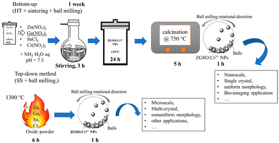 In this study, we prepare Zn1.33Ga1.335Sn0.33O4:0.5%Cr3+ (ZGSO:0.5%Cr3+) PersL materials using both SS and HT methods, as shown in Scheme 1. Even though these two methods have been widely used for other materials in the industry, they have yet to be applied to ZGSO:0.5%Cr3+. We then report our comparison of the structure, morphology and optical properties, and use BM to downsize these compounds to nanoscale. Following this procedure, we provide details on the optical features of ZGSO:0.5%Cr3+ nanomaterials. Finally, in order to move toward applications, the properties of ZGSO:0.5%Cr3+ while suspended in water are presented, including concentration and size effects. This paper suggests that ZGSO:0.5%Cr3+ nanoparticles could be valuable probes for further bioimaging applications, using the appropriate synthesis method.