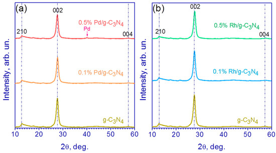 In order to characterize the crystalline phase of the Pd/g-C3N4 and Rh/g-C3N4 samples, XRD patterns of the synthesized photocatalysts were obtained (Figure 1). Figure 1 shows that there are two main peaks in the XRD patterns, located at 13 and 27°; these peaks can be attributed to g-C3N4 [16]. The peak located at 13° corresponds to the reflection from the (210) plane and is due to the distance between the heptazine (tri-s-triazine) units in the 2D g-C3N4 layer, and the diffraction peak (2θ~27°) belongs to the (002) plane and determines the distance between the 2D layers of g-C3N4 [35,39]. It can be seen that the characteristic g-C3N4 peak at 27° becomes broader and weaker with the increase in Pd and Rh content (Figure 1). For the sample 0.5% Pd/g-C3N4, a characteristic peak at 40.1° appears, which belongs to the (111) diffraction plane of metallic Pd (Figure 1b). For the rest of the rhodium- and palladium-containing samples, no metal peaks were found, probably due to low mass fraction of Rh and Pd.