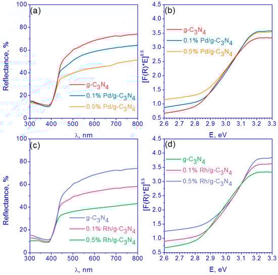 The optical properties of synthesized photocatalysts were investigated using UV–Vis spectroscopy (Figure 2). One can see that the absorption edge for all samples is ca. 400 nm (Figure 2a,c). Also, the deposition of noble metals promotes the adsorption of visible light in the range 400–800 nm. Figure 2b,d show the data transformation for pristine g-C3N4, Pd (0.1 and 0.5 wt.%)/g-C3N4 and Rh (0.1 and 0.5 wt.%)/g-C3N4 photocatalysts in Tauc’s coordinates for indirect semiconductors. It was shown that the deposition of metals has almost no effect on the band gap energy, which is in the range of 2.77–2.83 eV for all the samples.