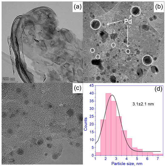 (a–c) HRTEM images of 0.5% Pd/g-C3N4 photocatalyst; (d) Pd particle size distribution calculated based on HRTEM data.