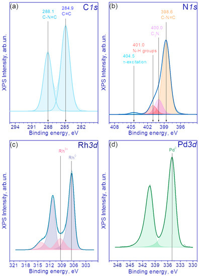 The study of the chemical composition of the samples was carried out with the XPS technique. The XPS spectra of the catalysts revealed peaks corresponding to Pd, Rh, N, C and O. Figure 5a,b shows the C1s and N1s spectra of pristine g-C3N4. The C1s spectrum is well described by two peaks with binding energies of 284.9 and 288.1 eV. The first peak is characteristic of carbon-containing impurities present on the surface of the objects under study (often used to calibrate the binding energy scale). The second peak is characteristic of C1s g-C3N4 and corresponds to carbon forming bonds with nitrogen atoms in the g-C3N4 structure [41,42]. In the case of the N1s spectrum, four peaks are observed with binding energies of 398.6, 400.0, 401.0 and 404.5 eV. According to the literature data, the first peak refers to nitrogen atoms forming a C-N=C bond, the second one to N-(C)3 bonds with three carbon atoms, the third one to the N-H terminal groups and the fourth peak corresponds to an excited π bond [41].