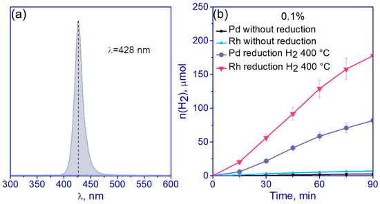 The activity of all synthesized samples 0.01–0.5% Pd/g-C3N4 and 0.01–0.5% Rh/g-C3N4, as well as the activity of pristine g-C3N4 and Pd- and Rh-containing samples before the reduction in hydrogen (with adsorbed complexes of palladium or rhodium after drying), was studied in the photocatalytic production of hydrogen in aqueous and aqueous alkaline solutions of TEOA. TEOA was chosen as a sacrificial agent as it helps to reduce photocorrosion of g-C3N4 because the amino groups of TEOA effectively bind to the surface of g-C3N4 [44,45]. Alkaline solution was used to facilitate proton abstraction during TEOA oxidation and to prevent charge recombination on the catalyst surface [46]. The photocatalytic activity was studied with the use of LED with a maximum emission at a wavelength of 428 nm as a light source (Figure 6a). Previously, it was shown that when using a diode with a maximum radiation in this region, the highest AQE was observed [35]. Note that over pristine g-C3N4, the rate was equal to zero both under neutral and alkali conditions. Figure 6b shows the kinetics of hydrogen formation for 0.1% Pd/g-C3N4 and 0.1% Rh/g-C3N4 samples without heat treatment and with H2 reduction at 400 °C.
