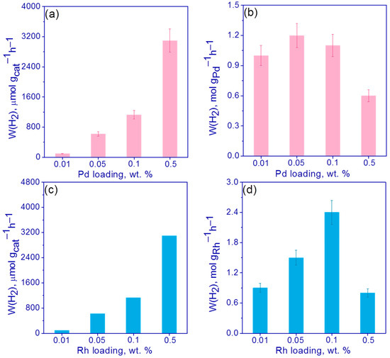 (a,b) Activity of 0.01–0.5% Pd/g-C3N4 and (c,d) 0.01–0.5% Rh/g-C3N4 photocatalysts in hydrogen evolution (a,c) per 1 g of catalyst and (b,d) per 1 g of metal. Conditions: C(cat) = 0.5 g/L, 10 vol.% TEOA, C0(NaOH) = 0.1 M, 428 nm LED.