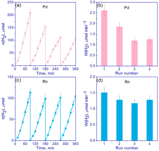 Next, the stability of the most active photocatalysts, 0.5 wt.% Pd/g-C3N4 and 0.5 wt.% Rh/g-C3N4, was investigated in four runs in alkali (C0(NaOH) = 0.1 M) suspensions of TEOA, each of which lasted 1.5 h. After every 1.5 h of the reaction cycle, the suspension was purged with argon for 30 min. Figure 8a,c shows the kinetic curves and Figure 8b,d shows H2 evolution rates for the cyclic experiments.