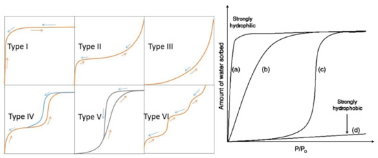 Adsorption isotherms for water in different types of nanoporous adsorbents near room temperature. IUPAC classification of adsorption isotherm types (left) and adsorption patterns with respect to hydrophilicity (right) [50,59,60,61]. Reprinted with permission from ref. [60] (left) and from refs. [50,59] (right). Copyright 2019 Royal Society of Chemistry, 2014 American Chemical Society, and 2008 Elsevier, respectively.
