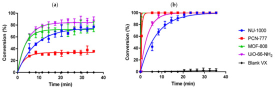Degradation rates of VX in various aqueous-phase Zr-MOFs. (a) Pure water solution. (b) NEM buffer solution [90]. Reprinted with permission from ref. [90]. Copyright 2017 American Chemical Society.
