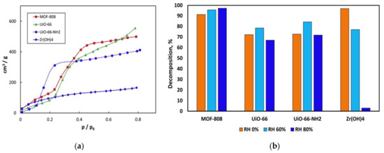 One of the few works considering the solid-phase implementation of MOFs under humid conditions is that of Ryu et al. [71], who evaluated the impact of water loading on Zr-MOF functionality towards hydrolysis of GD and VX. By measuring degradation rates under pretreatment conditions of 0, 60, and 80% RH, it was found that UiO-66, the amino-functionalized UiO-66-NH2, and MOF-808 all showed a high decomposition ability of both nerve agents regardless of the air humidity conditions. Comparison of these Zr-MOFs to the relatively more hydrophilic Zr-based catalyst Zr(OH)4 provided additional insight into the impact of water affinity on hydrolytic performance, as shown in Figure 5.