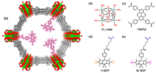 (a) Schematic representation of Br-BDP@NU-1000; (b) Zr6 node of NU-1000, with SALI-displaceable aqua and hydroxy ligands shown in green; (c) structure of organic linker of NU-1000, (d) H- BDP, and (e) Br-BDP [99]. Reprinted with permission from ref. [99]. Copyright 2017 American Chemical Society.