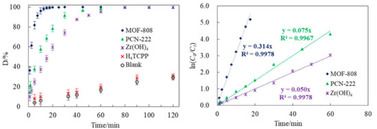 This drawback was displayed in the work of Wu et al. [108], who investigated HD oxidation by H2O2 in different Zr-based materials and found that degradation of HD in blank reaction solution under standard room lighting did not accelerate with the addition of pure H2TCPP, the porphyrin ligand of the PCN-222 Zr-MOF. As shown in Figure 7, the reaction solution containing PCN-222 did achieve more enhanced catalytic activity towards HD degradation under standard room lighting than the blank solution, but this was attributed to the catalytic Zr6 sites and three-dimensional framework contributed by the MOF rather than the presence of porphyrinic linkers [108]. Such findings help draw attention to the fact that the reported performances of many of the photosensitizers discussed in this section rely on protic solvents and/or consistent exposure to light of specific wavelengths. While it is clear from these reports that photosensitizers can be successfully functionalized into MOFs in various ways, their intended purpose may ultimately be a challenge to realistically exercise.