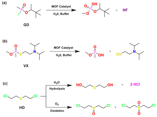 Detoxification/hydrolysis pathway of CWAs. (a) Nerve agent GD; (b) nerve agent VX; (c) vesicant agent HD [1,6,17]. Reprinted with permission from ref. [1] and reproduced with permission from refs. [6,17]. Copyright 2021 American Chemical Society, 2017 Elsevier, and 2016 Wiley-VCH, respectively.