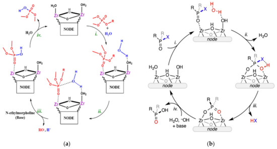 Two main mechanisms are commonly proposed for the hydrolysis of organophosphorus nerve agents and their simulants in Zr-MOFs. These pathways are mainly differentiated by the participation of free H2O and the resulting mode of nerve agent binding on the MOF SBU (secondary building unit, i.e., inorganic metal cluster), as shown in Scheme 2. The elementary steps are as follows: (i) binding of the organophosphorus compound to an open Lewis acidic metal site; (ii) nucleophilic attack at phosphorus by either an external water molecule (Scheme 2a) or by the ligand group (OH or OH2) that terminates the adjacent metal site of the node (Scheme 2b); (iii) elimination of the leaving group from the organophosphorus compound by scission of the P-X bond (P-F bond in GB and GD, P-S bond in VX); and (iv) removal of the monodentate (Scheme 2a) or bidentate (Scheme 2b) hydrolyzed product from the active site [3,73,74,75].