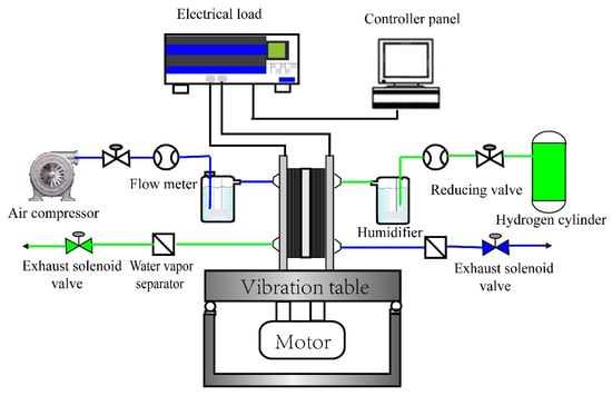 In Figure 1, the experimental bench is composed of the vibration generator, the electronic load, the data acquisition system, the bubble humidifier and the gas supply system. The vibration tests of PEMFC were performed on the horizontal and vertical vibration generator controlled by computer software, which could produce excitations of multiple waveforms within the frequency scope of 1 Hz to 600 Hz with the maximum displacement of 5 mm. Its acceleration amplitude is up to 20 g and the maximum load is 100 kg.