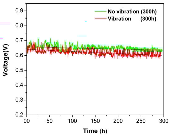 The degradation of the PEMFC running continuously for 300 h under vibrational and static conditions is exhibited in Figure 2. Under vibration conditions, the cell voltage drops with a faster rate during the 300 h operation, the average performance of the PEMFC decreases from 0.643 V to 0.612 V and the degradation rate reaches 103 μVh−1. While running at no-vibration conditions, a voltage difference from 0.658 V to 0.642 V is indicated and the voltage decay rate is approximately 53 μVh−1. The U.S. Department of Energy sets the stack voltage at the end of lifetime as 90% of the initial voltage at the rated power output [3], and the degradation rate is assumed to be constant based on the results of relevant studies [22,27]. It can be inferred that the durability of the MEA under static condition can reach 1500 h, which only reaches 700 h under vibration conditions. The voltage drop is one of the manifestations of the vehicular PEMFCs’ performance degradation caused by chronic pavement vibration. In addition, the voltage fluctuates greatly under vibration conditions, which is an interruption phenomenon caused by instability in the PEM fuel cell operation under vibration.