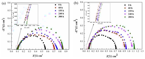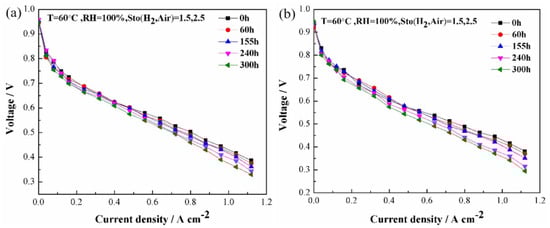 Figure 3a,b present the polarization curves of the PEMFC operating at different duration under vibration and no-vibration conditions, respectively. The kinetics region remains almost unaltered, and the ohmic region seems to slightly degrade compared to the non-vibration experiments. With the growth of current density, the attenuation ratio of voltage that represents the slope of the voltage value before and after the decay under the increase of the unit current density becomes larger under both cases. Particularly when running for 240 h at no-vibration conditions, the performance of the cell remains stable with the current density less than 400 mA cm−2, but in the mass-transfer region density the voltage gradually falls off; the mass-transfer region is the most affected section of the polarization curves, indicative of a degradation of the electrode structure. Compared with above results, the voltage under vibration has shown a small decline at the current density of 400 mA cm−2 and decreases faster along the time in the high-current-density region.