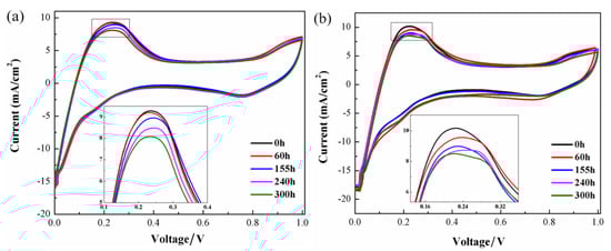 The cyclic voltammograms measured after running at different test duration under vibrational and static conditions are presented in Figure 5. Obviously, the oxidation desorption peak of hydrogen is observed at about 0.2 V and the peak area decreases with the increase of operating time under both cases. The electrochemical active surface area (ECSA) can be calculated with the following equation [29]: