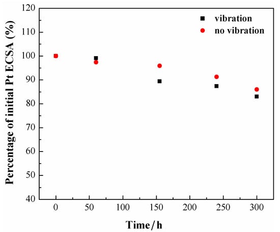 As is shown in Table 2, ECSA reduces with the increase of operating time, which changes between 60.1 and 49.6 m2 g−1, respectively, under vibration conditions and falls from 57.5 to 50 m2 g−1 under static conditions. In Figure 6, the ratio between the effective active area and the initial active area after different running times is plotted. It can be observed that the effective active area has decreased greatly in the vibrational environment since the operation time of 150 h and the drop degree of the ratio under vibration is always greater than that under no-vibration conditions. The decline of ECSA to the catalyst may be on account of the agglomeration and dissolution of Pt nanoparticles, as well as the detachment of Pt nanoparticles from the carbon support.