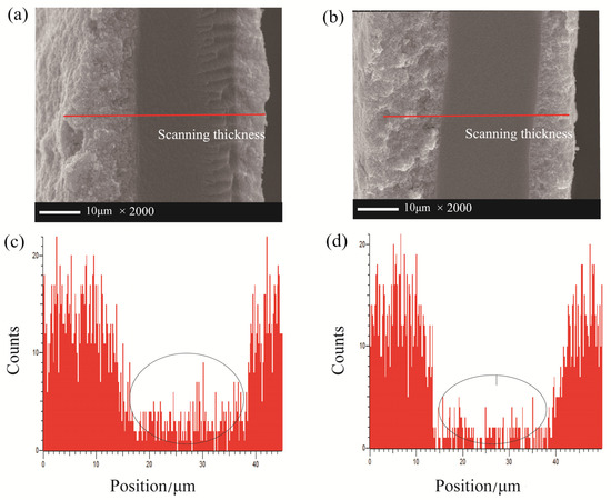 To further explain the attenuation mechanism of MEA in a vibration environment, EDX element analysis is performed on the cross-section of MEA at the end of 300 h accelerated tests in vibration and no-vibration environments. From Figure 8a,b, the cross-section of MEA shows that the interfaces of the catalyst layer to the membrane are very flat and without delamination under vibration and static conditions. Furthermore, it can be seen in Figure 8c,d that after a long time of operation, the polymer membrane which contains no platinum element shows the existence of platinum under both cases. This illustrates that the dissolved Pt ions from the cathode side transfer into the polymer membrane along the hydrophilic channels and redeposit in it, which also give rise to the drain of ECSA [32,33,34]. Meanwhile, much more platinum is detected inside the proton exchange membrane under vibration conditions than static conditions. The Pt catalyst loading of both cases before the tests are equivalent, so that more Pt particles drain from the catalyst layer, resulting in greater loss of the electrochemical active area and the performance of PEMFC.