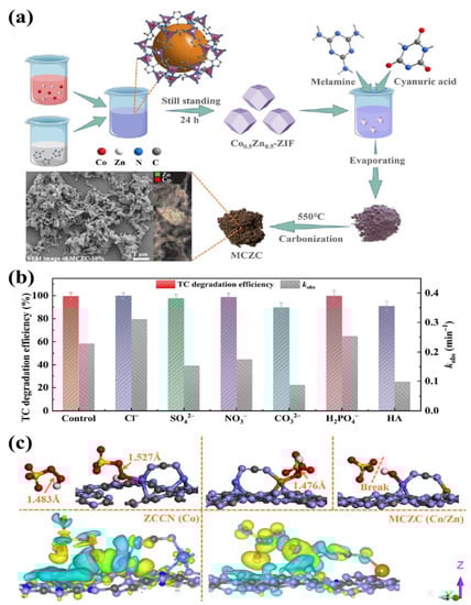Li et al. constructed CoZn-ZIF as a porous, non-bonding nano-catalyst CoZn-N-C (MCZC) using thermal etching technology (Figure 5a), which could enhance the electron transfer between the Co active site and the Zn active site and construct the unsaturated metal sites of Co and Zn atom pairs to the maximum extent [105], improving the synergistic effect between different active sites of the catalyst. When the photocatalytic time is 24 min, the maximum removal efficiency of TC in the MCZC/PMS/Visible-light system was 99.6% (the mineralization rate was 55.8%), while that in ZCCN (ZCCN was the thermal etching product of ZIF-67) was only 74.9% without visible-light irradiation. A variety of anions (including Cl−, SO42−, NO3−, CO32− and H2PO4−) and natural organic matter (HA) did not significantly affect the maximum degradation efficiency of the MCZC/PMS/Vis/TC system, but the removal rates were significantly different. The presence of Cl- and H2PO4− increased the catalytic rates of MCZC, while the rest showed inhibition (Figure 5b). The internal mechanism of the catalytic performance improvement for MCZC was explained mathematically by density functional theory (Figure 5c). When PMS was adsorbed on the Co active site at the photocatalyst surface of ZCCN or MCZC, the O-O bond length of PMS would be outstandingly stretched (from 1.483 Å or 1.476 Å to 1.527 Å) at visible-light irradiation driving. Thus, as for MCZC, the PMS was more easily activated by photogenerated electrons to produce SO4•− and •OH.