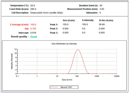 The Zetasizer showed that the average particle size of C. citratus AgNPs aggregates was 100.6 d. nm, with a polydispersity index (PDI) value of 0.193 and an intercept of 0.916 (Figure 3). The results were based on the intensity where, at 100% intensity, the average peak size was 126 ± 58.88 d. nm. From these results, the PDI width was equal to 19.4158.