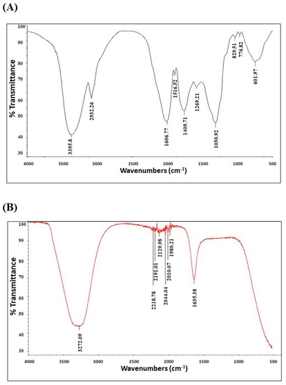 FTIR analysis of results of C. citratus products. The results were produced by the Nicolet 6700 FTIR Spectrometer at 500–4000 cm-1. (A) FTIR results of the aqueous extract, (B) FTIR results of AgNPs.