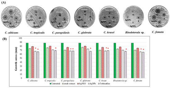 The antifungal activities of different treatments of C. citratus. Candida strains were grown on PDA dishes for 24 h. By the well-diffusion method, the cultured were treated by either 10% of the aqueous extract of C. citratus, 100% of the synthesized AgNPs, AgNO3 (2 µM), or 0.125 μg/mL Terbinafine. (A) Petri dishes of the treated species. (B) Chart of the growth areas diameters. E: crude extract; +C: Terbinafine positive control, * indicated significant p-value less than 0.05.