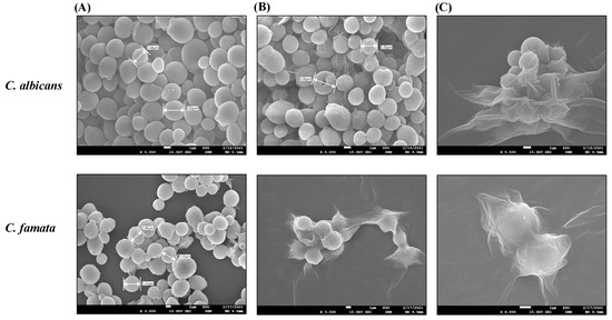 SEM images of C. albicans and C. famata treated with C. citratus AgNPs. SEM images were evaluated by the Scanning Electron Microscope SU3800 (HITACHI, Tokyo, Japan). (A) images of the untreated species at ×3500 magnification. (B) images of the AgNPs-treated species at ×3500 magnification for C. famata and ×5000 magnification for C. albicans. (C) images of the AgNPs-treated species at ×8000 magnification for C. famata and ×5500 magnification for C. albicans.