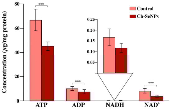 Concentration levels for ATP, ADP, NADH, and NAD+ in HepG2 cells exposed to Ch-SeNPs (1 mg/L). Results are plotted as the mean ± relative standard deviation (n = 10). The data were evaluated via ANOVA and subsequent Bonferroni test (*** p < 0.001; ns: non-significant).