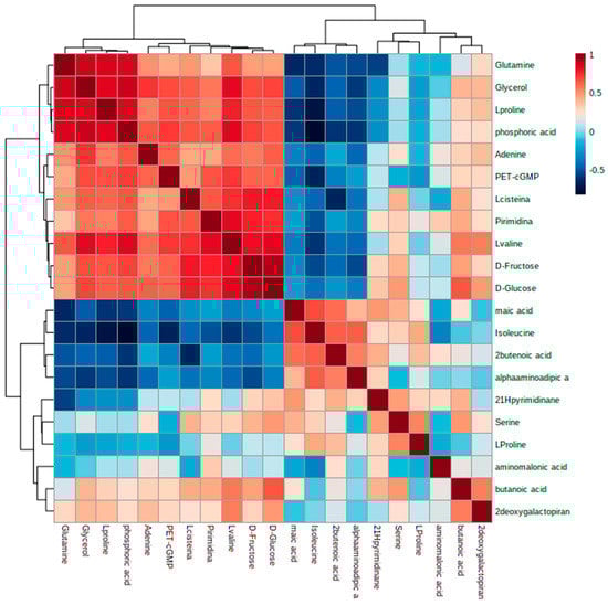 Hierarchical cluster analysis and heatmap of metabolites found at different levels (represented by colors) in control vs. treated samples (p < 0.05).