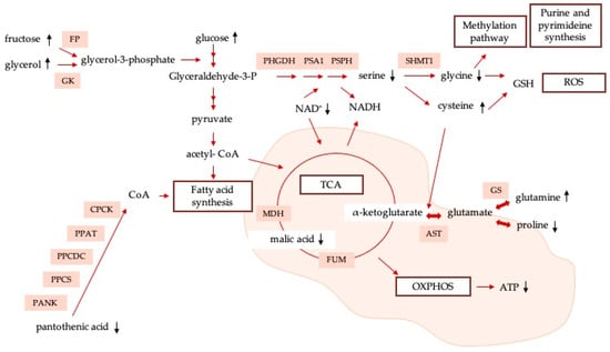 Although being a relevant route in terms of oxidative phosphorylation, it has been observed that, under certain circumstances, cancer cells bypass the TCA cycle and predominantly use aerobic glycolysis for fulfilling their bioenergetic, biosynthetic, and redox-balance requirements. Recent evidence suggests that tumor cells are able to uncouple glycolysis from the TCA cycle, allowing the use of glutamine (RM = 4.85) to meet their needs []. Specifically, cancer cells are normally characterized by significantly promoting glutaminolysis in comparison to healthy cells, giving glutamine a central role in cancer proliferation [,]. Kamphorst et al. [] demonstrated that KRAS-driven pancreatic cells scavenge proteins from the extracellular space for their lysosomal degradation in amino acids, such as glutamine, used to fuel the TCA cycle. In a similar way to what happens with glutamine, after Ch-SeNP exposure, HepG2 cells produce higher quantities of cysteine (RM = 3.69) as compared to untreated cells. Cysteine is a proteinogenic amino acid with a free thiol group that confers particular properties on the functional sites of proteins. This amino acid plays key roles in the metabolic rewiring of cancer cells to withstand poor-nutrient and oxygen-deficient conditions. These roles are, for example, being a precursor of glutathione, regulating oxidative stress, and serving as a carbon source for biomass and energy production. In particular, cysteine is metabolized and converted into 3-mercaptopyruvate (3-MP), releasing one amino group that reacts with α-ketoglutarate, generating glutamate and pyruvate, and fueling, in an alternative way, the TCA cycle []. Higher levels of cysteine show that cells are rewiring their metabolisms in order to provide alternative ways of maintaining the normal functioning of the pathway, thus confirming that the main sources are altered due to Ch-SeNP exposure. Finally, fructose (RM = 2.16) has been revealed as a strong modulator of metabolic syndrome, preferentially promoting the glycolytic pathway, and capable of inducing mitochondrial dysfunction and oxidative stress (suppressing aconitase in the TCA cycle) []. In addition to glucose, it has been suggested that fructose could also serve as an alternative nutrient for the growth of cancer cells. A scheme of the alteration of energy metabolism, previously described, is shown in Figure 6. It shows the main metabolites and metabolic pathways affected as a consequence of exposure to Ch-SeNPs, as well as the main proteins involved in them.