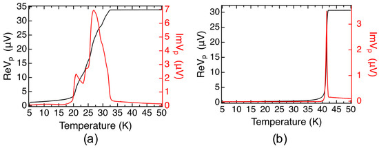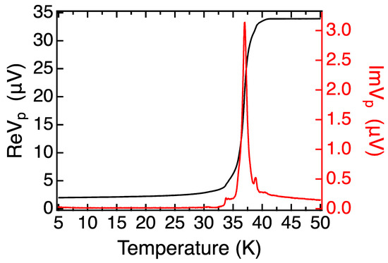The MI technique is indeed very sensitive to the different superconducting transitions present in the measurement region. For example, if the film contains two regions with different critical temperatures, say Tc1 > Tc2, upon cooling down, a superconducting transition occurs in the region with the higher Tc1, and this triggers a change in the signal of the pick-up coil. The visually most apparent feature is a peak in the imaginary (dissipative) part ImVp(T), with the onset at Tc1. As the temperature is lowered further to cause the other region to become superconducting, another separate peak in ImVp(T) will occur near Tc2. This situation is illustrated well in Figure 2a and Figure 3b,d; some small secondary peaks are also seen in Figure 7. If inhomogeneity is not described by two or more discrete values of Tc but rather by some distribution, the peaks in ImVp(T) will broaden, or even merge into a single broad peak.