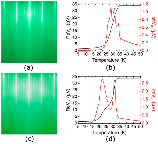 During the synthesis of the LSCO/LSAO/LSCO trilayers, we did not detect, by RHEED, the formation of any precipitates of unwanted phases, nor any indication of 3D growth [51]. Still, one could suspect that the wide superconducting transitions in such trilayers may originate in the top LSCO layer, e.g., because its crystallinity could be affected by the imperfect epitaxy atop the LSAO barrier layer grown at a low temperature. To test this hypothesis, we studied two [18 × LSCO + 1 × LSAO] heterostructures where LSCO was synthesized at Ts = 630 °C and the LSAO layer at Ts = 200 °C. The corresponding RHEED patterns and MI plots are shown in Figure 3. Neither of these films contains the top LSCO electrode layer, and yet both show broad superconducting transitions with multiple peaks resolved in ImVp(T) plots (Figure 3b,d). Since, in both heterostructures, the LSAO layer was grown at a low temperature and the film was not heated up subsequently, we can also rule out massive interdiffusion of Al and Cu atoms. The most plausible explanation is that due to the presence of Al atoms nearby, the underlying LSCO layers may lose some structural oxygen atoms, and thus the transition broadening originates from an inhomogeneous distribution of these oxygen vacancies. This is supported by our observation of gradual deterioration and the eventual disappearance of superconductivity in optimally doped LSCO films covered with Al, at room temperature. We observed the same effect with other metals that are reactive and prone to oxidation, such as Ca or Sr, as well.