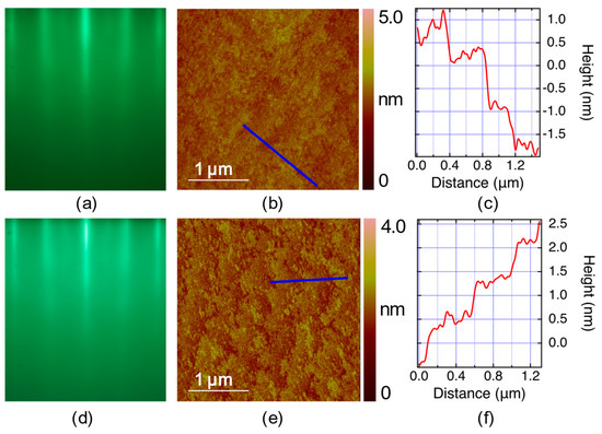 After growth, every film is studied by AFM to provide further information about the film surface morphology. The above has been amply confirmed, with statistics in the thousands, by a posteriori AFM study of the films. When the RHEED images are of high quality such as in Figure 4a,d, the AFM images typically show RMS roughness less than 0.5 nm, which is less than the c-axis lattice constant (1.3 nm). Indeed, the AFM images in Figure 4b,e show RMS roughness of 0.16 and 0.25 nm, so these films are essentially flat without any detectable 3D defects or outgrowths.
