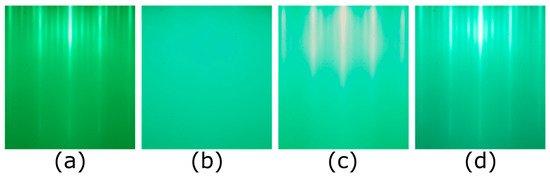 In each of these synthesis experiments, RHEED was used in real-time, all the time. It has been well established that as long as any secondary-phase precipitates are nucleated on the surface, even if these are just a few tens of nanometers wide, they can be observed by RHEED. An atomically smooth surface generates a RHEED image that only contains streaks, similar to what is shown in Figure 1a–d, Figure 3a,c and Figure 6a,c,d. The better the film crystallinity, the longer and sharper the streaks are. Another positive sign is the appearance of the diagonal (“Kikuchi lines”) streaks that come from inelastic scattering. These features are also apparent in Figure 4a,d. In contrast, if secondary-phase precipitates are present on the surface, one also observes spots, originating from transmission through the precipitates. These spots are very broad and fuzzy if the precipitates are small (for example, 10–20 nm wide) and become sharper as the precipitates grow bigger. Since these phases (La2O3, SrO, and CuO) have different lattice constants from LSCO, they typically appear at different positions in the inverse space (i.e., in between the streaks).