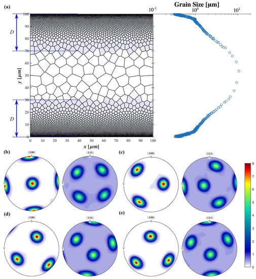 In the first investigation, the effect of thickness D was studied by fixing the specific rolling texture (as shown in Table 1) and varying D from 10 μm to 40 μm. In the second study, the different rolling textures of the FCC were assigned at D = 40 μm, with the grain orientation in the central region set to a random texture. An additional sample with all grains having a random grain orientation was set as the reference case. The pole figures of the different rolling textures of the FCC are shown in Figure 1.