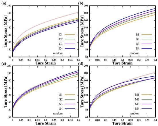 When comparing the random initial texture to the pole figures at 10% strain, it is apparent that the texture undergoes significant changes in both direction and strength. Specifically, the texture strength increases by more than a factor of 7. For more details, see Appendix C Figure A1. As shown in Figure 4, we can observe a remarkable change in the grain orientation of the texture {C} from the original state to the loading direction, compared to the textures {B} and {S} and {M} where a small number of the grains are not reoriented to the loading direction. Furthermore, it was observed that the intensity of loading direction alignment is approximately 1.2 times higher in texture {C} than in the other three configurations. This implies that more grains are reoriented to the loading direction, resulting in a rapid increase in the slip. Although the profiles are very similar between the textured {C} and random texture structures at 10% strain, the intensity in the [010] direction is still significantly higher in the former than in the latter.