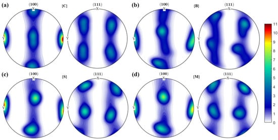 Pole figures of different textures at 10% strain: (a) {C}; (b) {B}; (c) {S}; and (d) {M}.