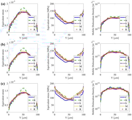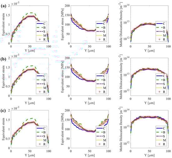 Spatial distributions of equivalent strain, equivalent stress, and mobile dislocation density along the y-direction when . Plots show the average equivalent strain (), average equivalent stress (), and average mobile dislocation density () at applied strain stages of (a) 10%, (b) 20%, and (c) 30%.